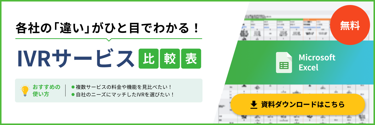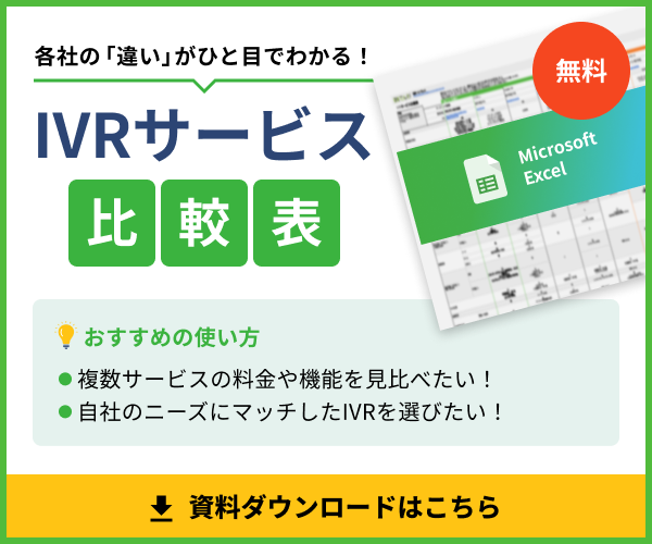 なお、以下からダウンロードできる比較表にはコールセンター向けIVRサービスも掲載しています。複数製品を横並びで比較したい方は、ぜひご活用ください。