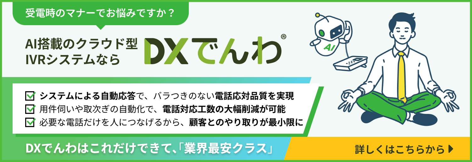そこでおすすめなのが、メディアリンクが提供する自動応答サービス「DXでんわ」です。DXでんわは、電話相手にあらかじめ用意した音声ガイダンスを案内するため、受電のタイミングでマナーや言葉遣いを過度に気にすることなく、電話応対品質を均一化することが可能です。