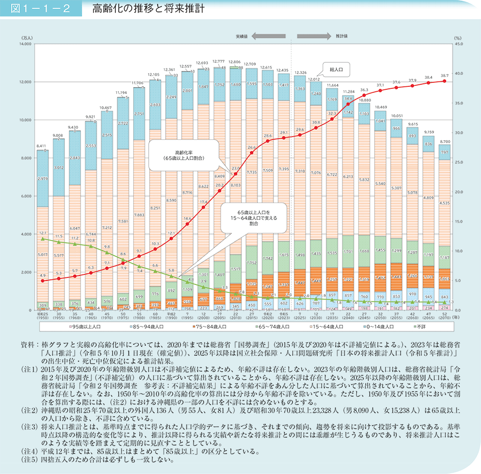 介護業界で人手が不足している大きな原因のひとつが、少子高齢化の加速です。内閣府の「令和7年版高齢社会白書」によれば、2023年10月1日現在、日本における総人口の29.1%が65歳以上の高齢者であることが示されています。